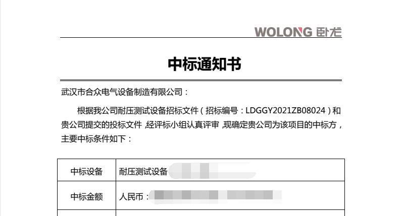 近日,我司收到了來自臥龍電氣的中標通知書,根據臥龍電氣招標文件和我司提交的投標文件,經評標小組認真評審,現確定武漢市合眾電氣為該項目的中標方。
