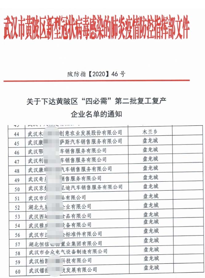 經過黃陂區疫情防控指揮部的批準,在黃陂區管委會及區經濟和信息化局的協調和大力支持下,武漢市合眾電氣收到了黃陂區“四必需”第二批復工復工企業名單的通知。