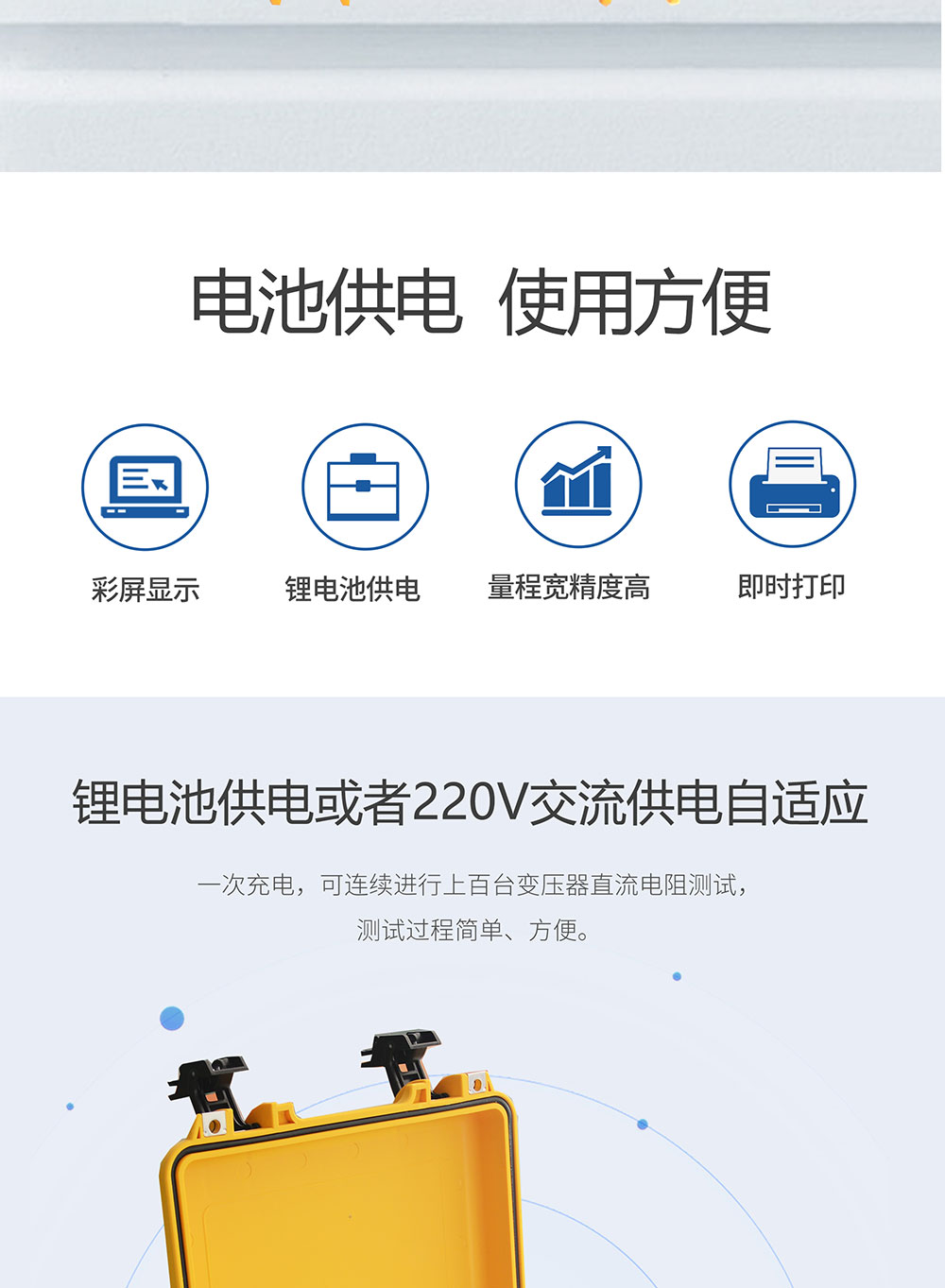 1、鋰電池供電或者220V交流供電自適應(yīng),一次充電,可連續(xù)進行上百臺變壓器直流電阻測試,測試過程簡單、方便。