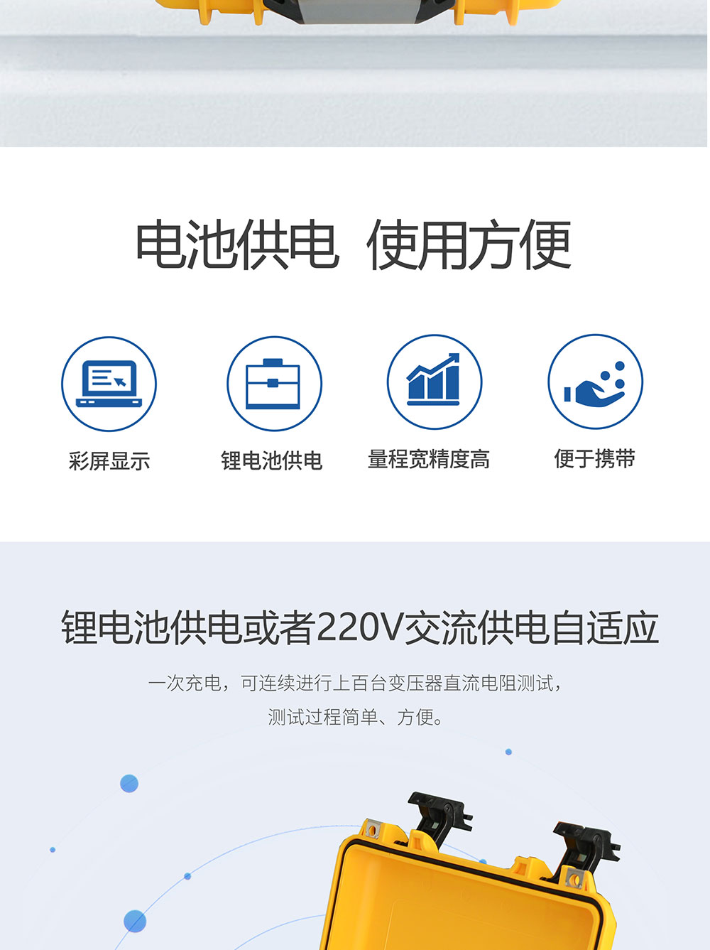 1、鋰電池供電或者220V交流供電自適應,一次充電,可連續(xù)進行上百臺變壓器直流電阻測試,測試過程簡單、方便。