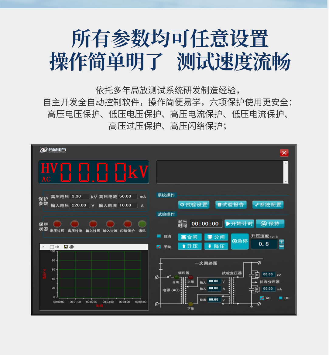 6、所有測試參數可提前進行設置,能達到高壓電壓放電擊穿電壓準確記憶、儲存、復位一系列功能;自動掃描時間設定,自動存儲電老化過程中的時間、電壓、電流等詳細記錄,方便用戶查看;