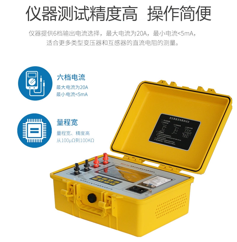 1、儀器提供6檔輸出電流選擇,最大電流為20A,最小電流<5mA,適合更多類型變壓器和互感器的直流電阻的測(cè)量。